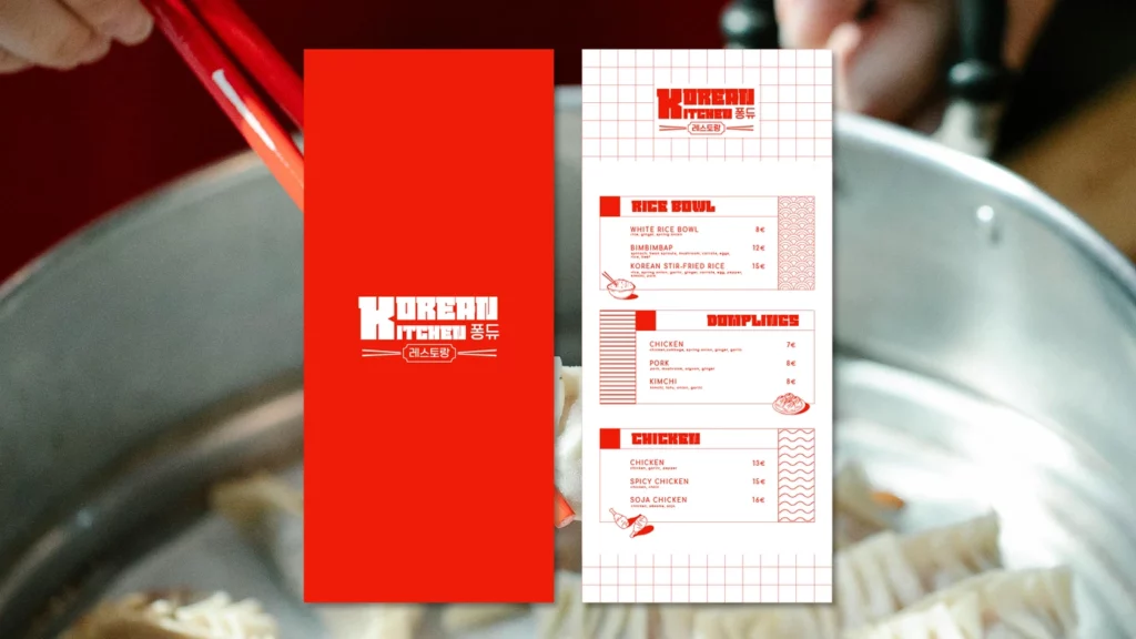 Les couleurs rouges et blanches dominent la palette, évoquant à la fois la passion et l’énergie de la culture coréenne. Ces couleurs contrastantes se marient harmonieusement pour créer un visuel accrocheur qui attire l’attention et stimule l’appétit.