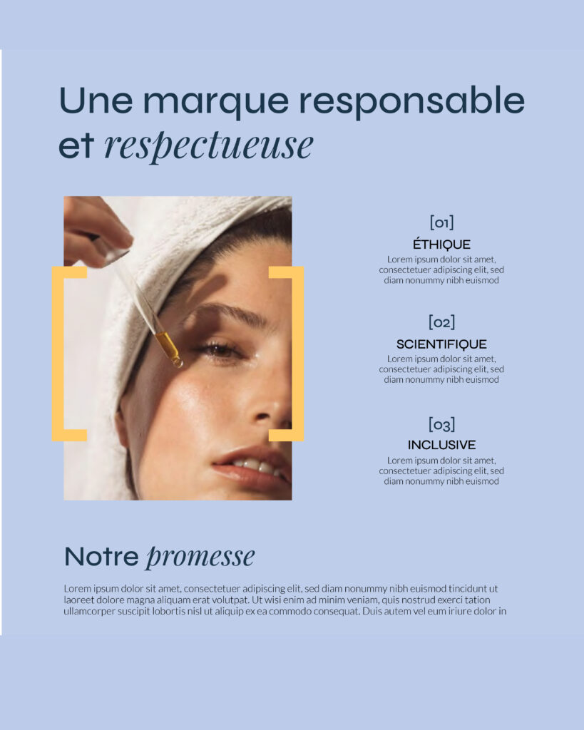 Les crochets présents dans le nom de la marque ont été détournés pour devenir l’élément différenciant central de l’identité graphique. Déclinés sur les packagings et les supports de communication, ils permettent à la marque de se démarquer efficacement. La charte graphique repose sur plusieurs palettes de couleurs, chacune composée d’une teinte forte et d’une teinte plus douce, apportant équilibre et cohérence. Cette dualité se retrouve également dans le choix des typographies, mêlant une police sans sérif moderne à une typographie avec sérif, légèrement italique, utilisée pour souligner les informations clés et rythmer la lecture.