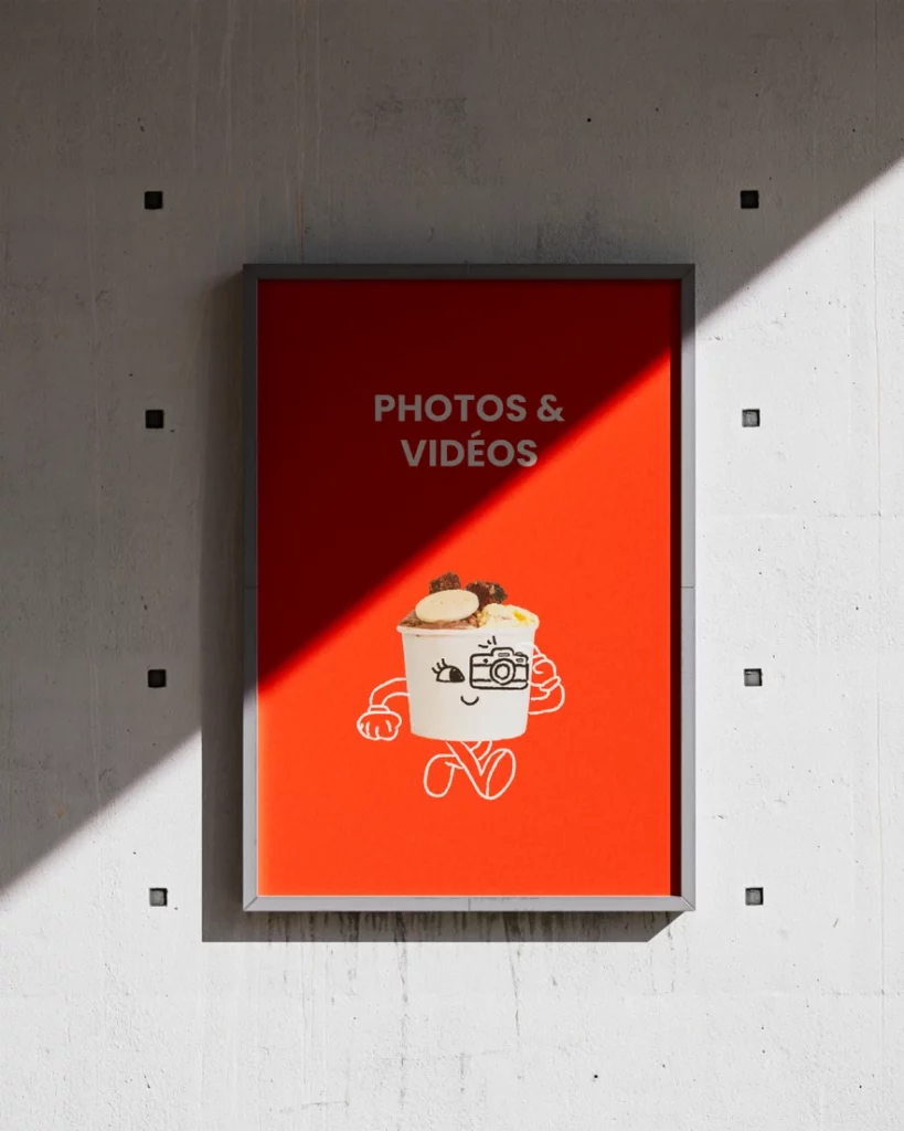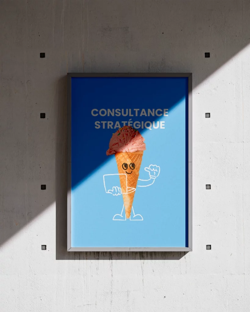 Doux et rassurant, le logo uniquement typographique joue sur la rondeur des lettres mais aussi la rondeur de la disposition. Il fait subtilement référence à une boule de glace, univers souhaité par les clients. Des glaces, mixant le réel et l’illustration, servent d’éléments de communication puissants et sont marqueurs des différents services de l’agence.