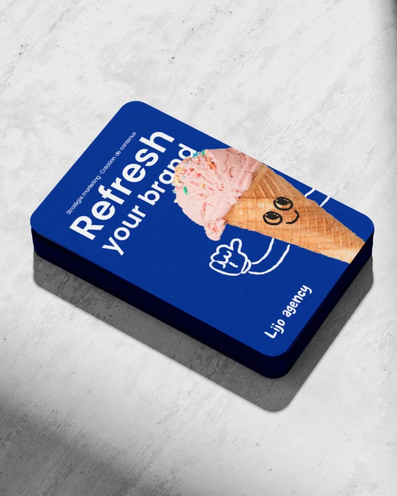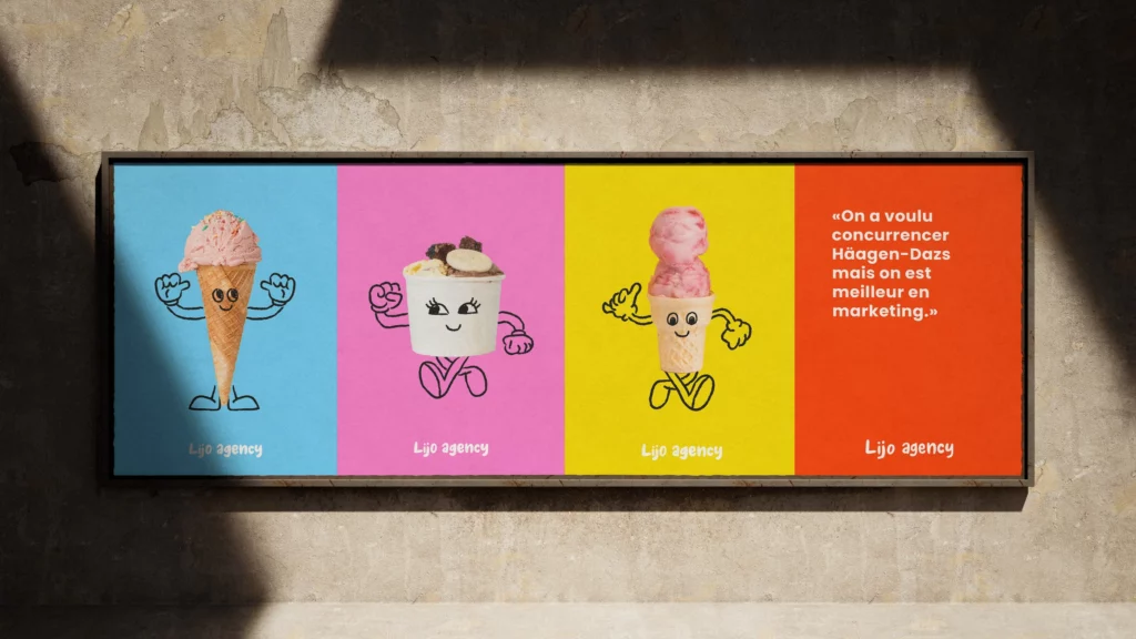 LIJO AGENCY est une agence pas comme les autres qui accompagne ses clients dans leurs aventures créatives : stratégie de marque, contenus sympas et publicités accrocheuses. En lien avec leur positionnement décalé et frais, nous avons réalisé une identité visuelle ludique et colorée, jouant sur l’univers de la glace, pour marquer la différence de l’agence.
