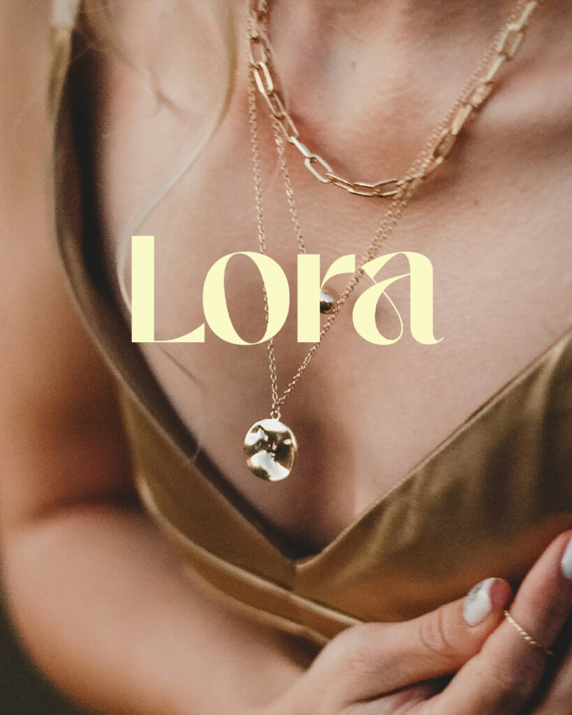 Le logo et les titres utilisent une typographie avec des boucles. Elle est féminine et délicate, rappelant la finesse du travail joaillier et l’univers de la mode. À l’inverse, le corps du texte repose sur une typographie plus mécanique, subtilement contrastée, qui apporte une touche d’élégance contemporaine et un style différenciant. Ce jeu typographique crée un équilibre harmonieux entre sophistication, personnalité et modernité, donnant à Laura une identité forte, actuelle et parfaitement alignée avec son positionnement.