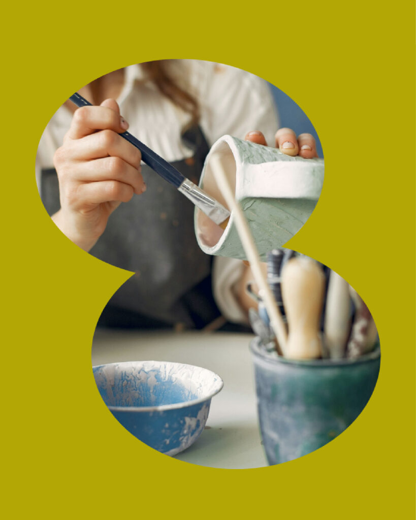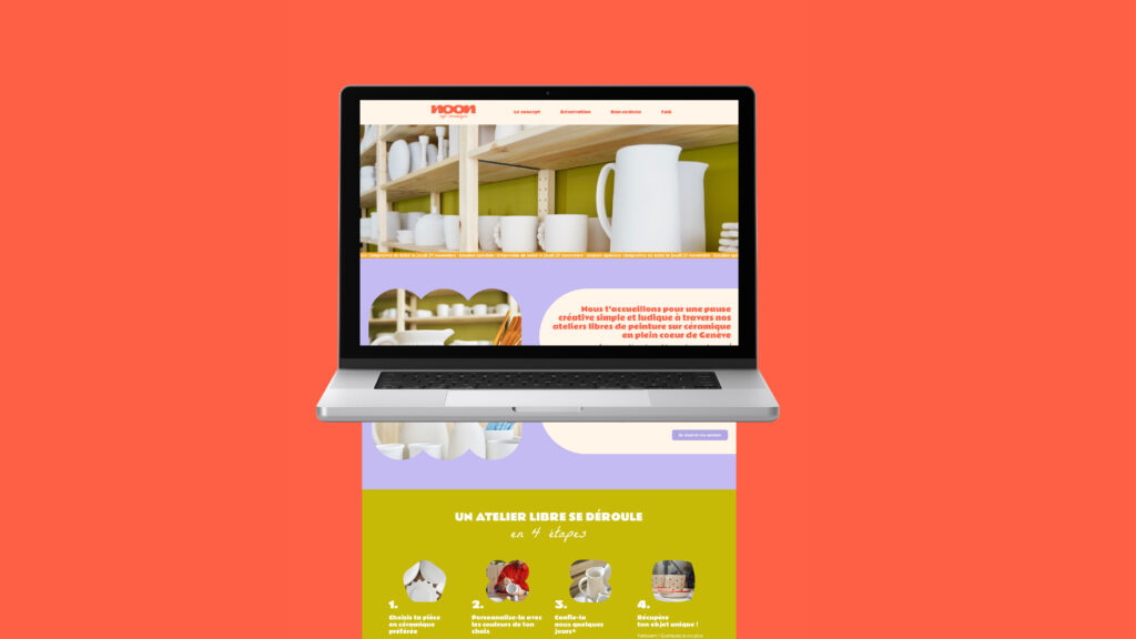 Pour Noon Céramique, nous avons imaginé un univers graphique haut en couleurs, chaleureux et rempli de rondeurs afin de refléter l’esprit artisanal et créatif du café céramique. L’objectif était de retranscrire l’atmosphère conviviale de l’atelier, où chaque pièce devient un espace d’expression. La palette vive et joyeuse met en avant l’énergie artistique du lieu, tandis que les formes douces évoquent la fluidité de la peinture et le plaisir de créer de ses mains.