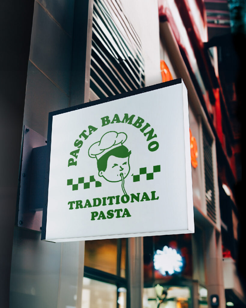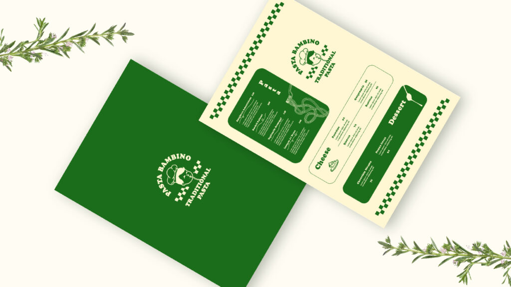 Pasta Bambino est un restaurant italien traditionnel spécialisé dans les pâtes, pour lequel nous avons imaginé une identité visuelle chaleureuse et authentique. La charte graphique reprend les codes emblématiques de la cuisine italienne avec une palette mêlant beige et vert, évoquant à la fois la tradition, la simplicité et le fait maison. L’objectif était de créer un univers convivial, immédiatement reconnaissable et profondément ancré dans l’imaginaire des trattorias italiennes.
