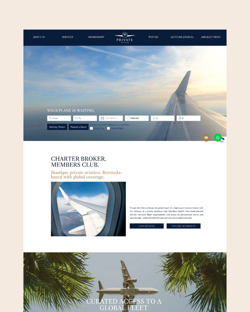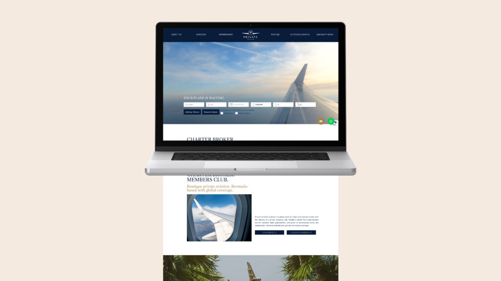 PRIVATE JET CLUB est une marque spécialisée dans la vente de places en jets privés, basée aux Bermudes. La marque a fait appel à nous pour repenser entièrement son identité visuelle et son site web, dont l’image ne reflétait plus le positionnement premium attendu par une clientèle haut de gamme. L’objectif était d’aligner l’univers de marque avec les codes du luxe et de l’aviation privée.