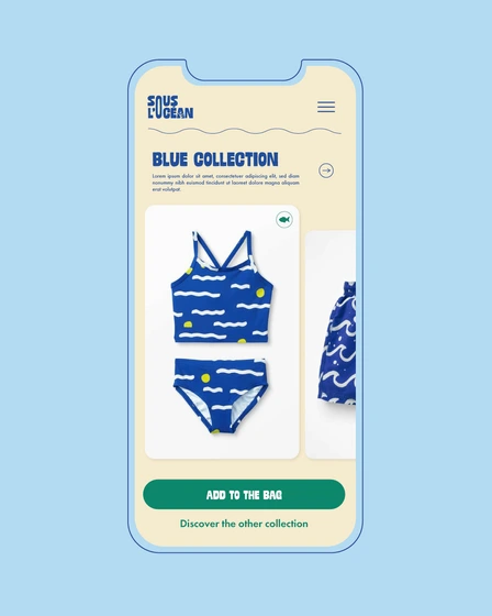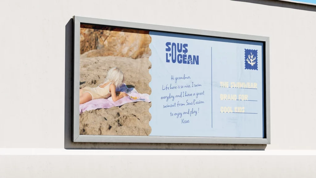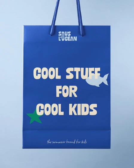 Sous l’Océan est une marque de maillots de bain pour enfants, pensée pour offrir un univers doux, joyeux et totalement immersif. Pour refléter cet esprit moderne et dans l’univers des enfants, nous avons imaginé une direction artistique douce enfantine, inspirée du littoral et de l’univers marin. La palette repose sur des tons sable, bleu foncé et bleu marine, permettant d’évoquer à la fois la douceur des vacances et la profondeur de l’océan.